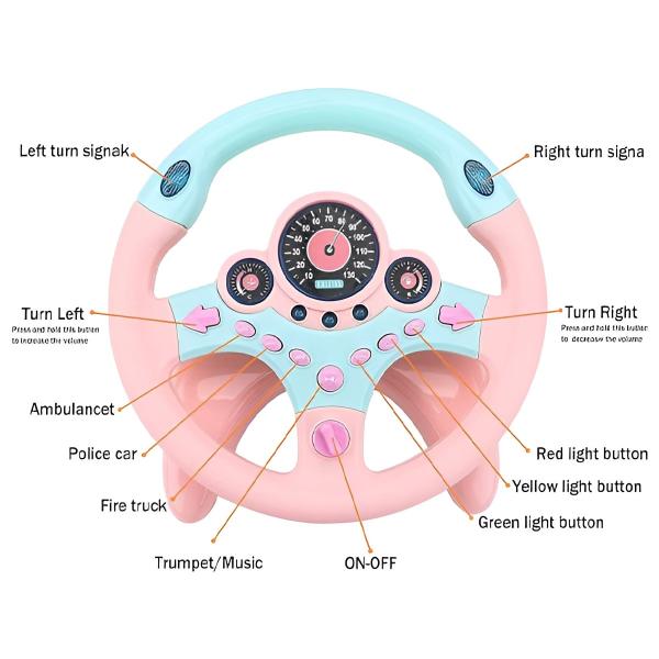 Σχεδιασμένο με διασκεδαστικούς ήχους, φώτα που αναβοσβήνουν και κουμπιά που είναι εύκολο να πατηθούν, αυτό το τιμόνι γοητεύει τους μικρούς οδηγούς και τους εμπλέκει σε ευφάνταστο παιχνίδι.