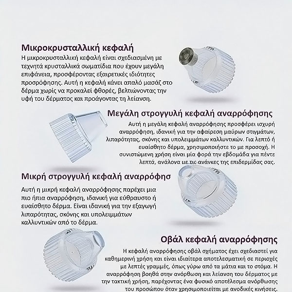 Η συσκευή διαθέτει 4 ανταλλακτικά εξαρτήματα, το καθένα από τα οποία έχει σχεδιαστεί για να στοχεύει σε συγκεκριμένες δερματικές ανησυχίες. Δείτε το παρακάτω γράφημα για περισσότερες λεπτομέρειες σχετικά με τον τρόπο λειτουργίας κάθε προσαρτήματος!